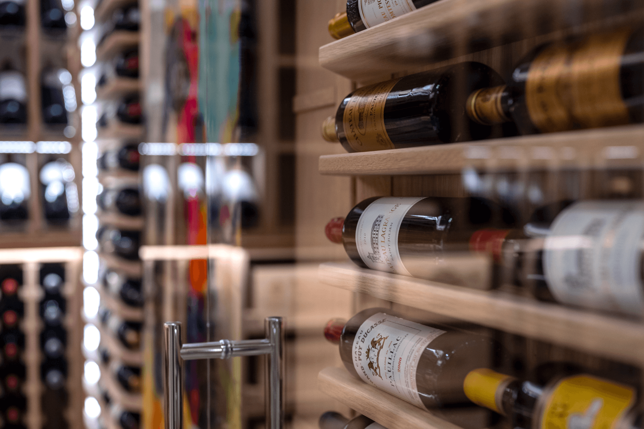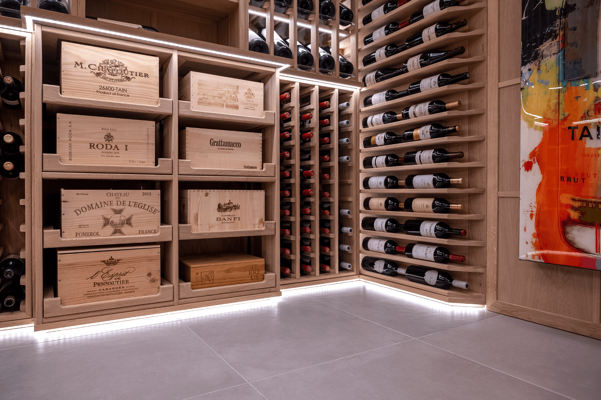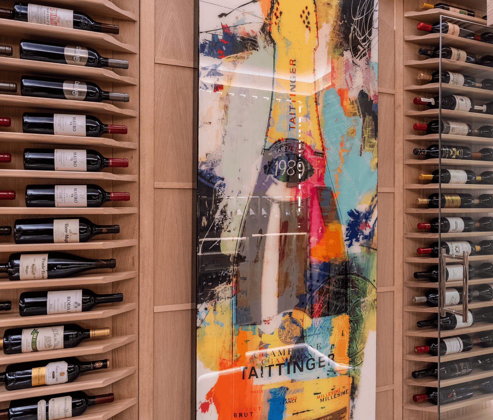 As a contrasting feature, one wall of the cellar is dedicated to a large, custom artwork, introduced by the client to add colour and personality to the space. The result is a balanced room that serves a clear function but also feels expressive and curated, a wine cellar with both purpose and presence.