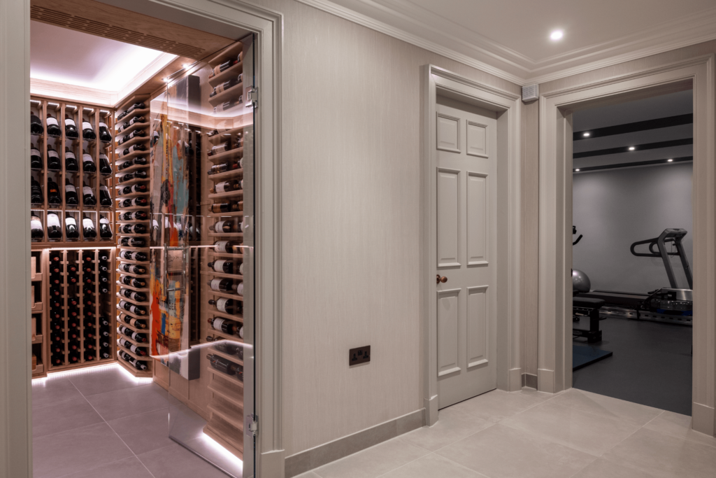 This wine cellar forms part of a larger basement-level entertainment space, which also includes a home cinema room and gym. The client’s brief was to create a dedicated wine room that would be compact, practical, and visually engaging, serving both storage and display functions.