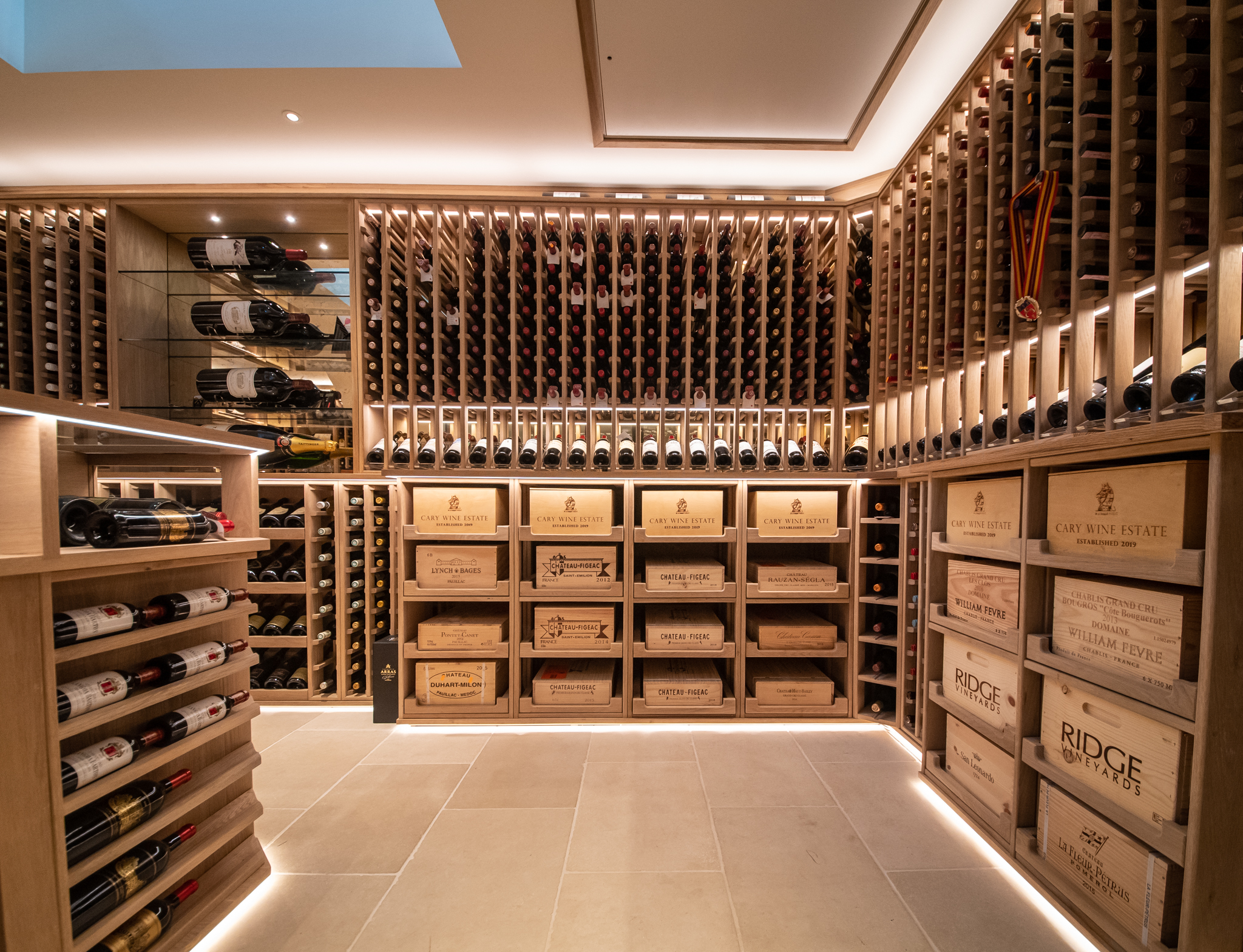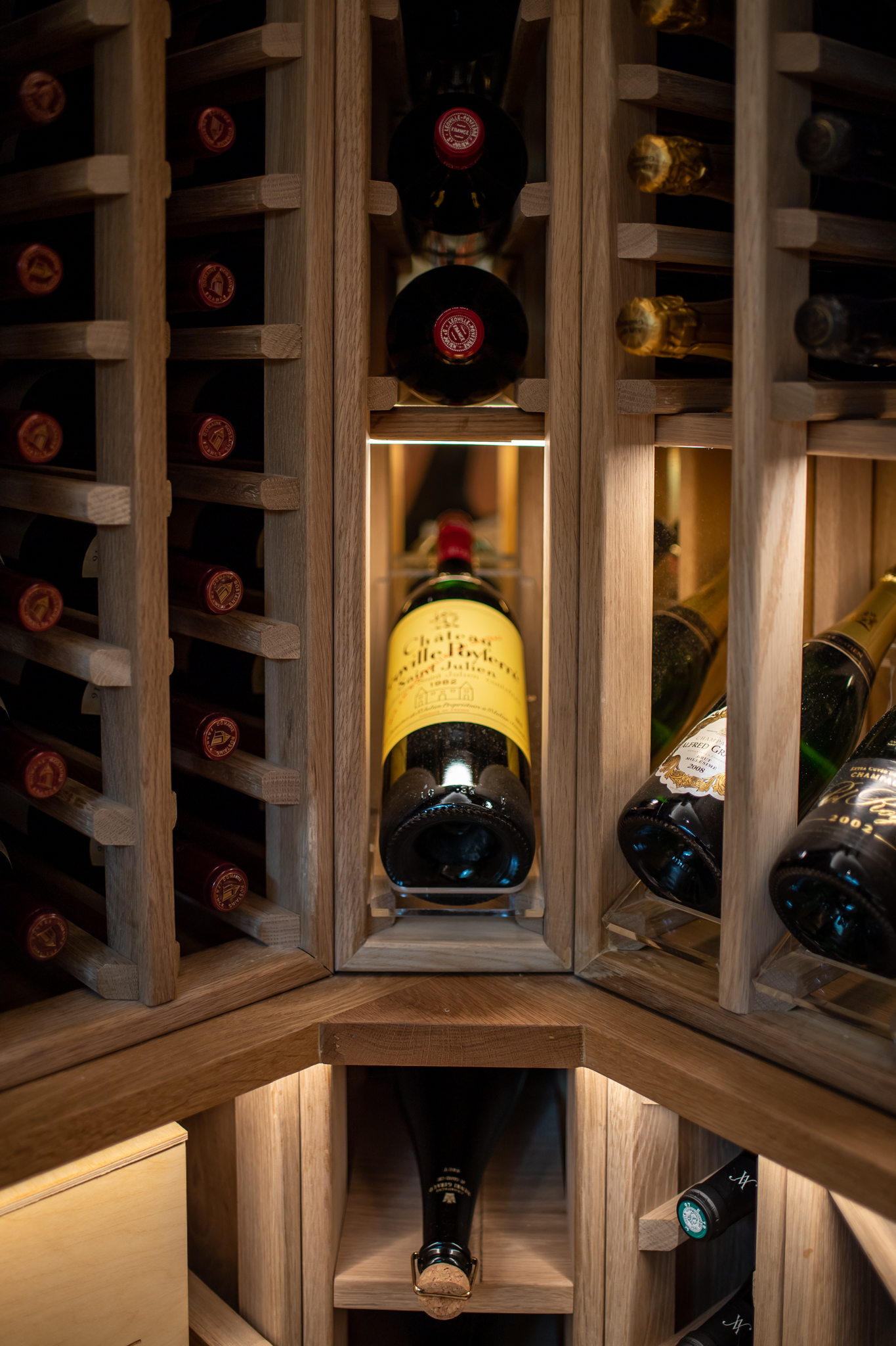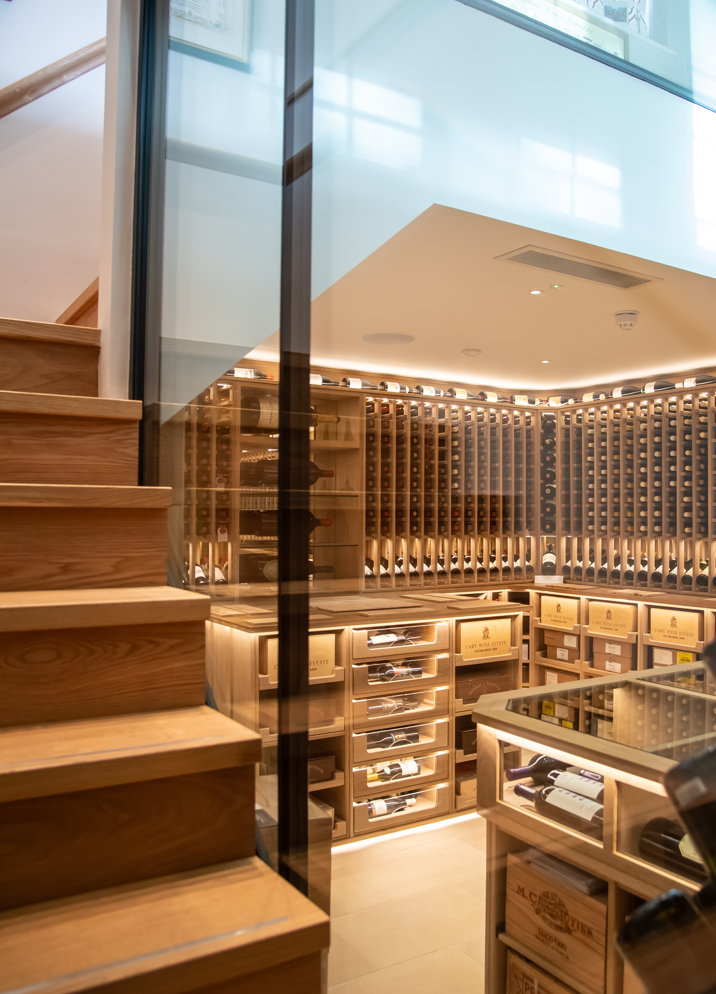 The brief required a cellar that delivered both practical storage and visual impact. The design specified White American Oak joinery for a clean, natural finish. Storage was designed specifically for the client’s private collection, including numerous branded cases, half bottles, dessert bottles, and large formats up to Balthazars. Small bottles are a rarity for most collectors and Sorrells enjoyed the opportunity to design specific racking to house them, including hand-carved grooved inlays. Sorrells also designed, laser-engraved and built personalised cases for the collection. The cellar includes a central tasting table with a glass top, positioned directly beneath the glass ceiling so it is visible from the upper floor. Glass walls and ceiling elements required precise alignment and careful detailing to maintain structural integrity and presentation quality.