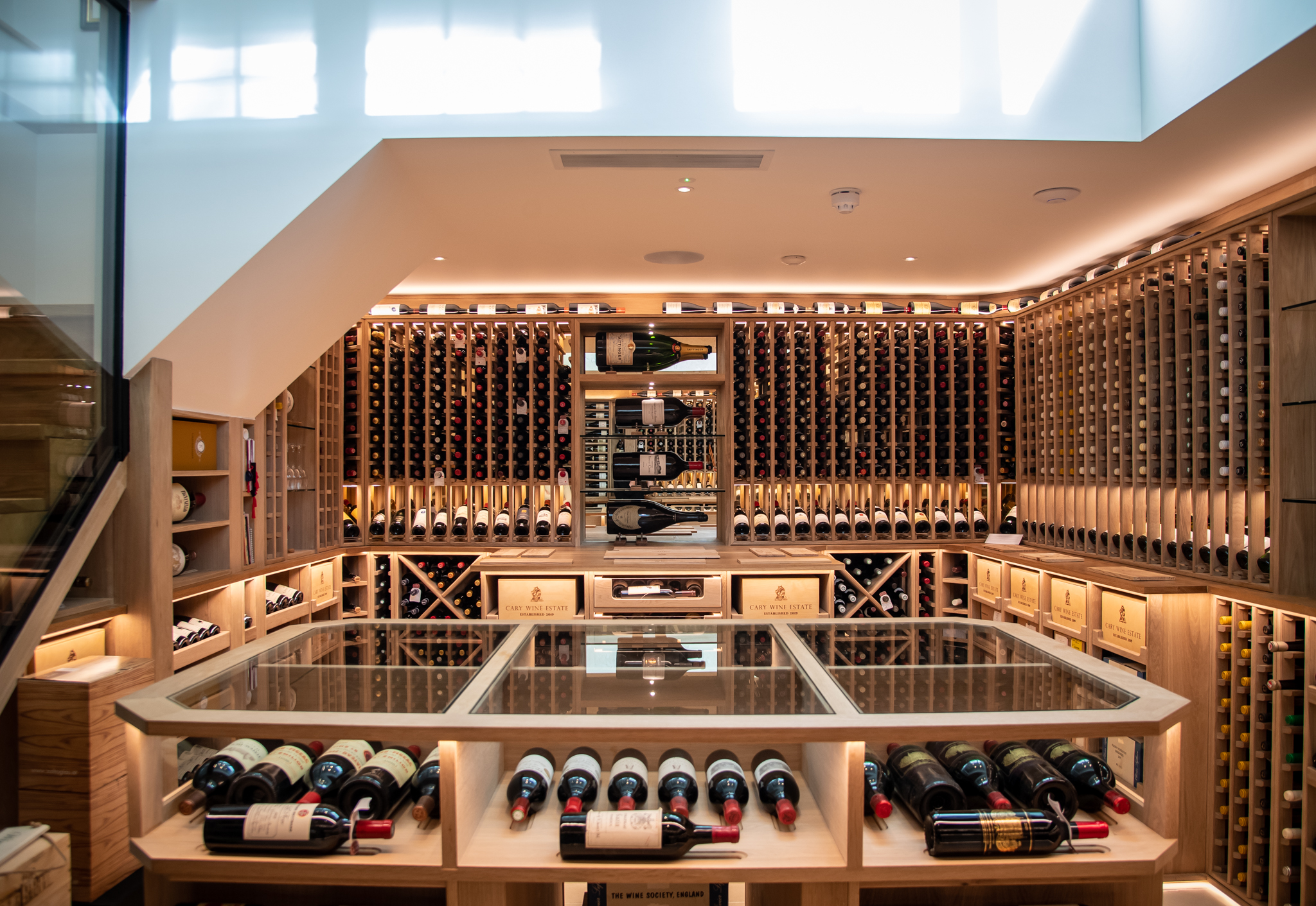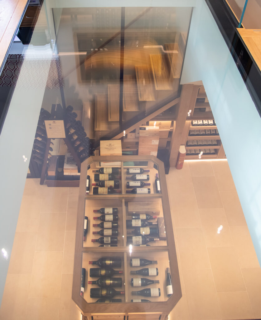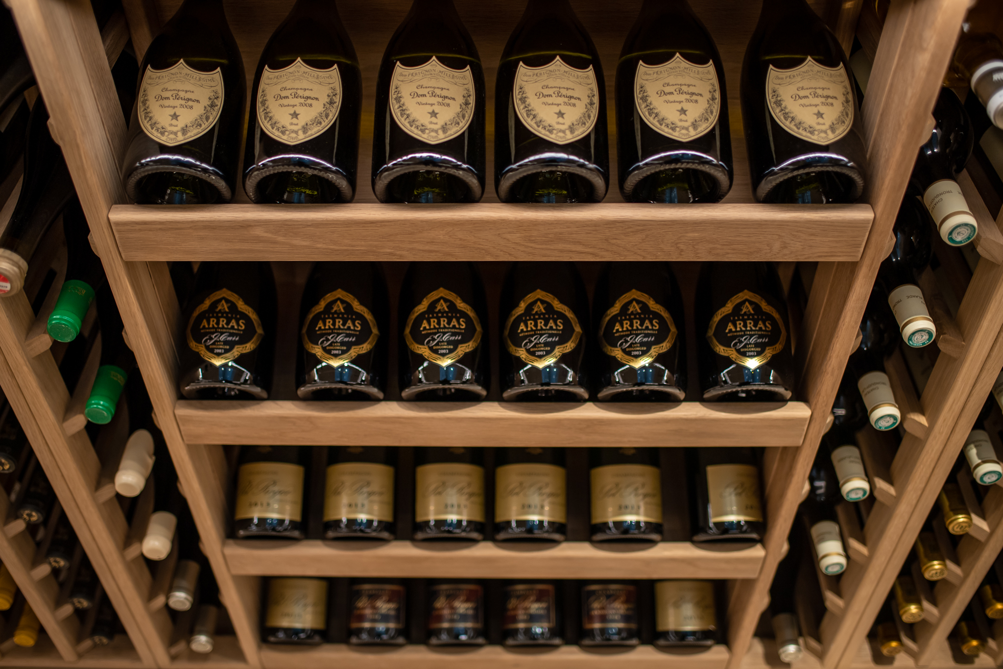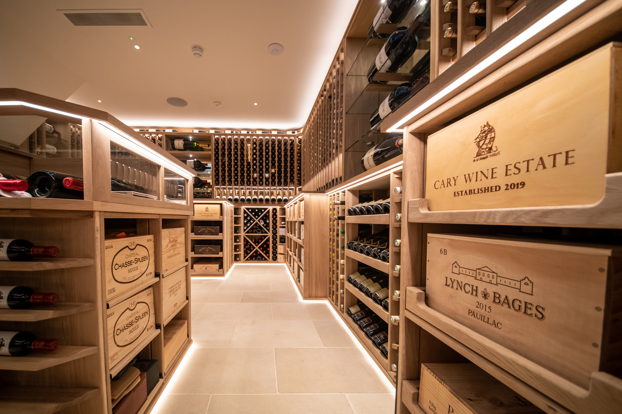 The brief required a cellar that delivered both practical storage and visual impact. The design specified White American Oak joinery for a clean, natural finish. Storage was designed specifically for the client’s private collection, including numerous branded cases, half bottles, dessert bottles, and large formats up to Balthazars. Small bottles are a rarity for most collectors and Sorrells enjoyed the opportunity to design specific racking to house them, including hand-carved grooved inlays. Sorrells also designed, laser-engraved and built personalised cases for the collection. The cellar includes a central tasting table with a glass top, positioned directly beneath the glass ceiling so it is visible from the upper floor. Glass walls and ceiling elements required precise alignment and careful detailing to maintain structural integrity and presentation quality.