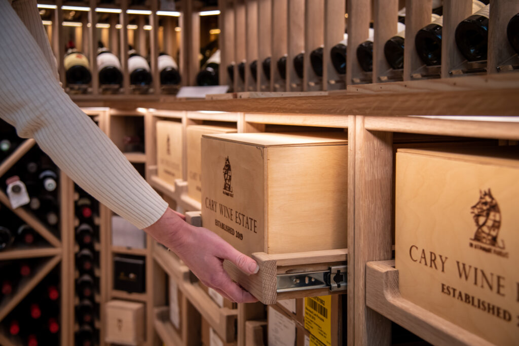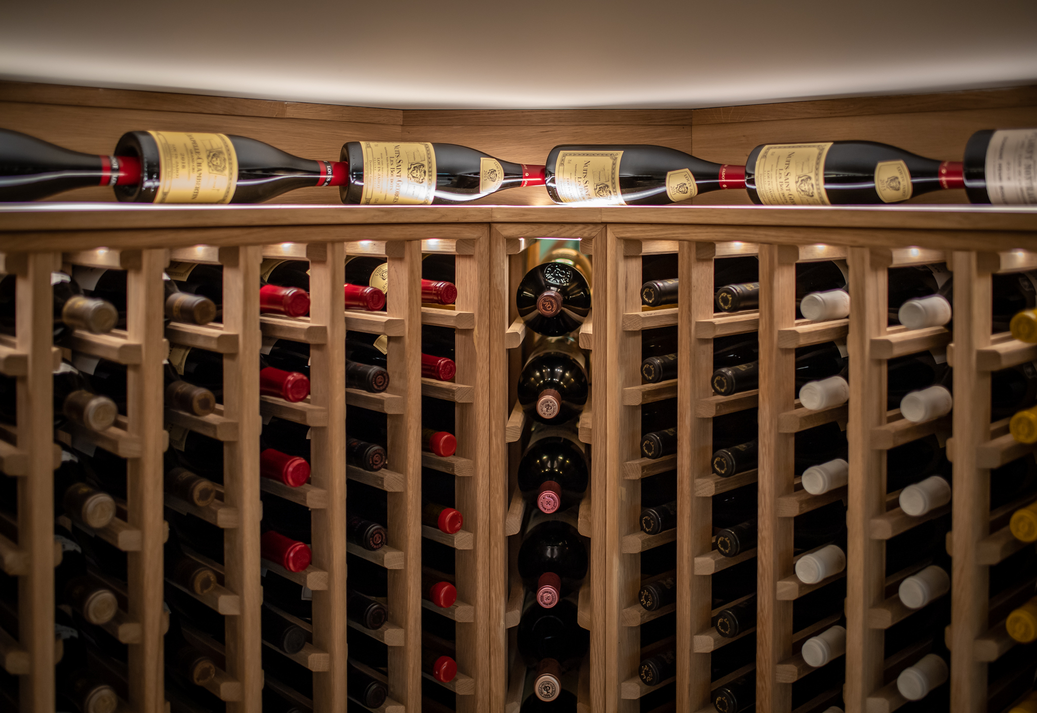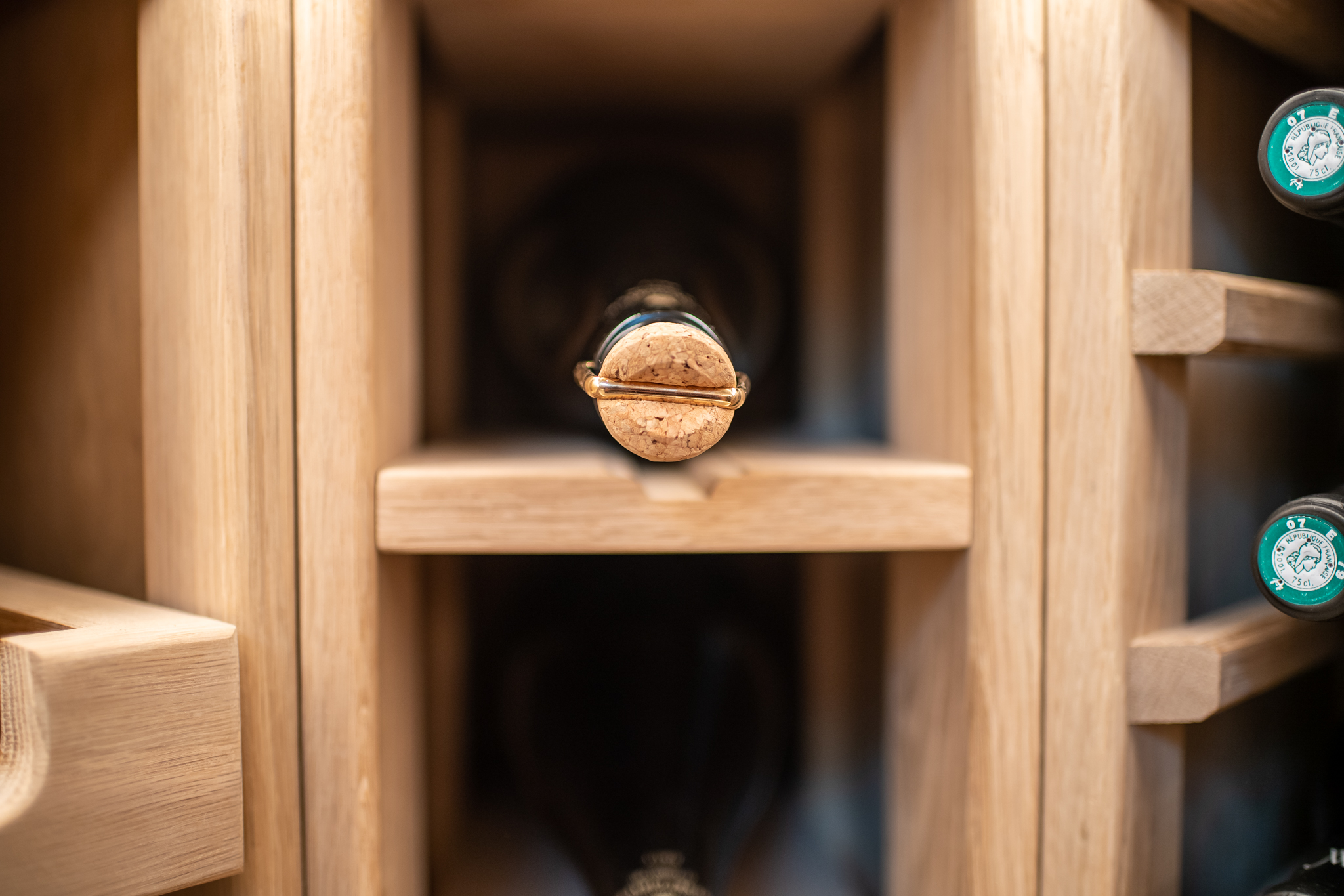 Bespoke case racks were designed to accommodate the client’s personal collection, with each solid oak case engraved with the vineyard’s emblem. Built from the same oak as the surrounding joinery, the cases ensure long-term storage while maintaining a unified aesthetic.