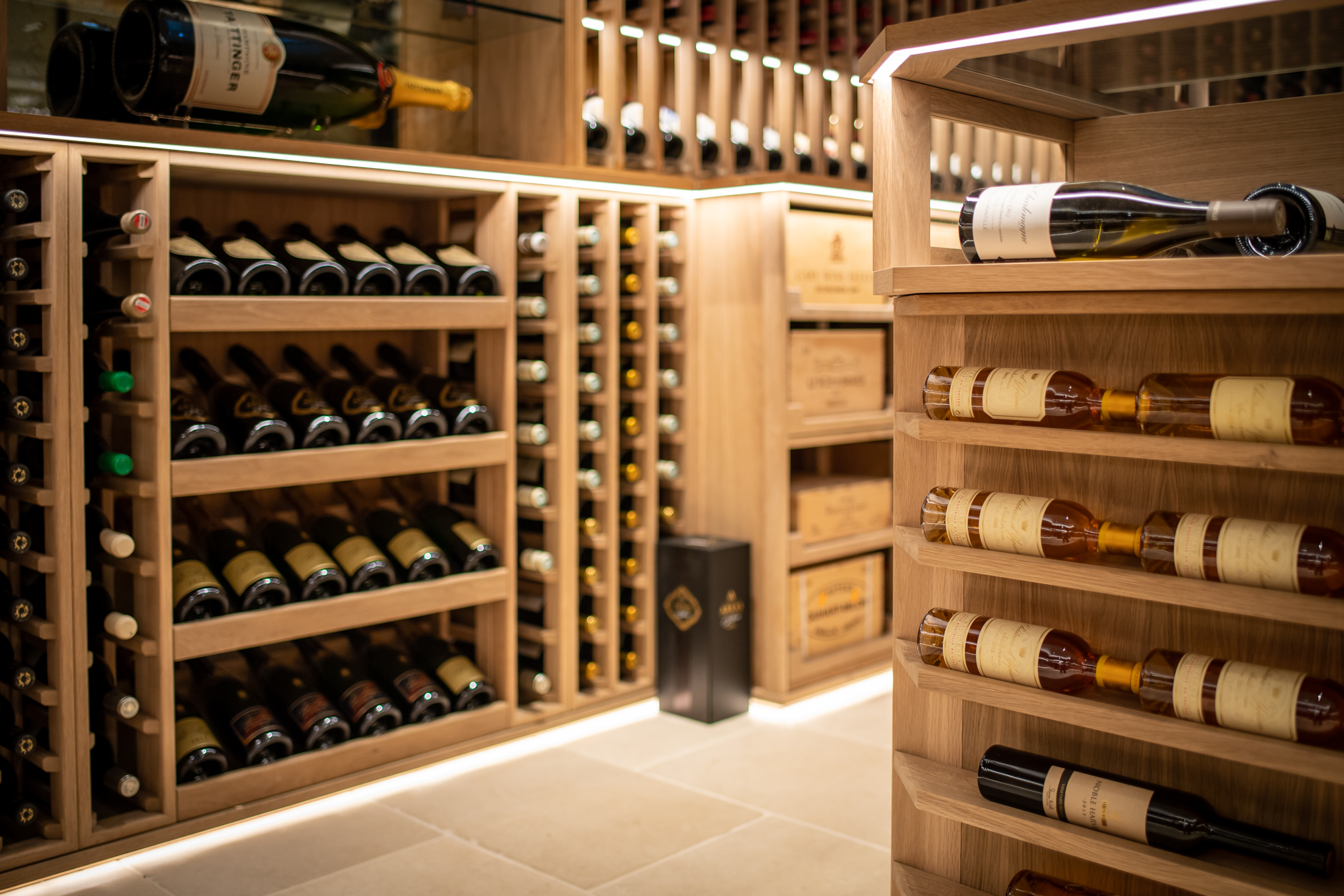 A solid Oak wine cellar, located in the glass ceiling basement. Light an airy, this cellar goes against the reputation of dark and dingy! With plenty of glass, light oak and soft LED lighting, this wine cellar supports the clients request for an attractive cellar with organised storage for their collection. The collection features numerous bottles from Kent vineyards as well as half bottles and large formats.