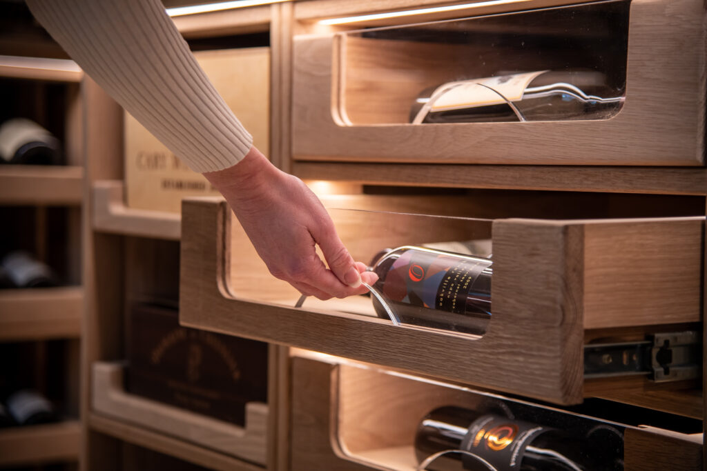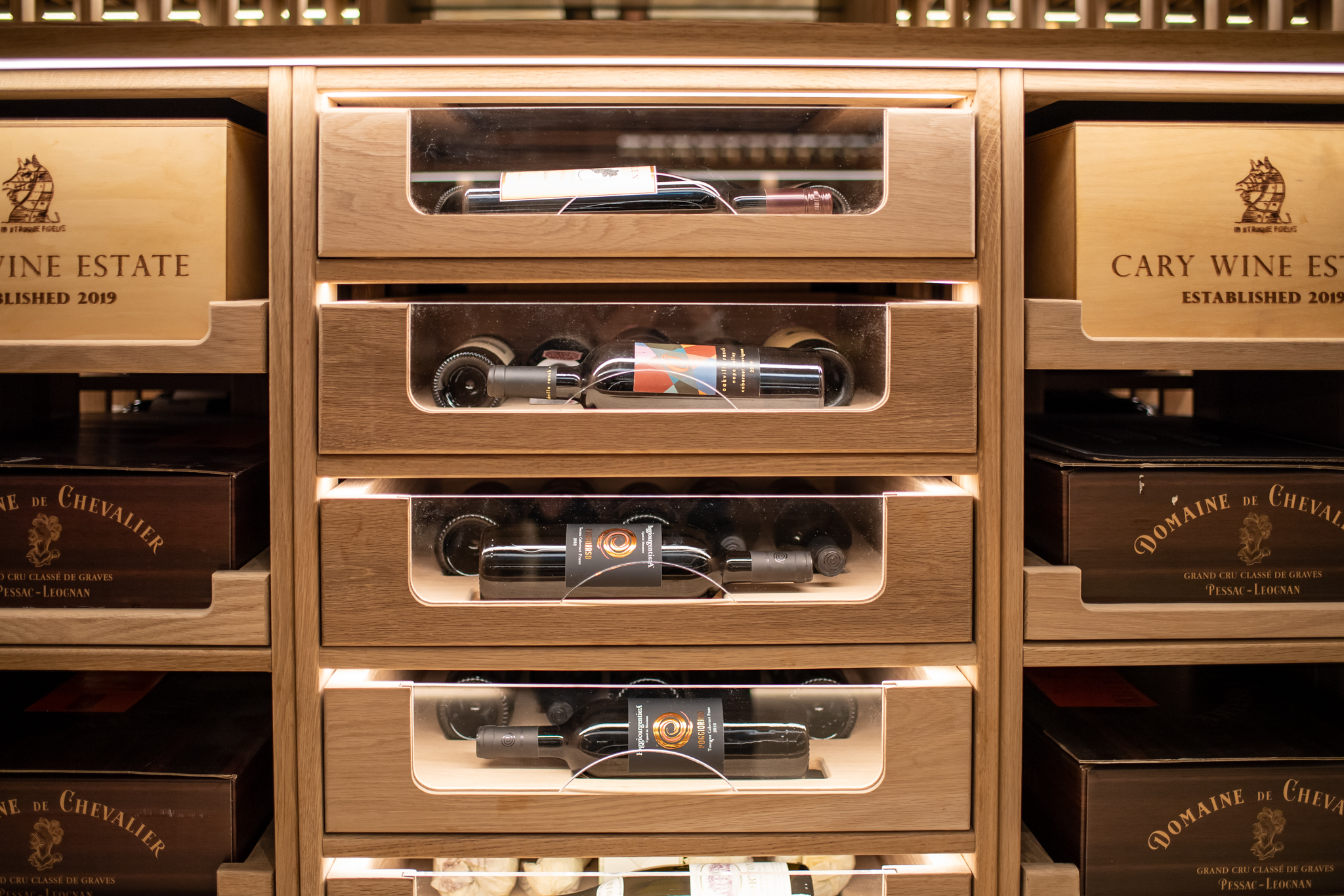 • Personalised cases upon soft close draws, engraved with the clients personal vineyard emblem.