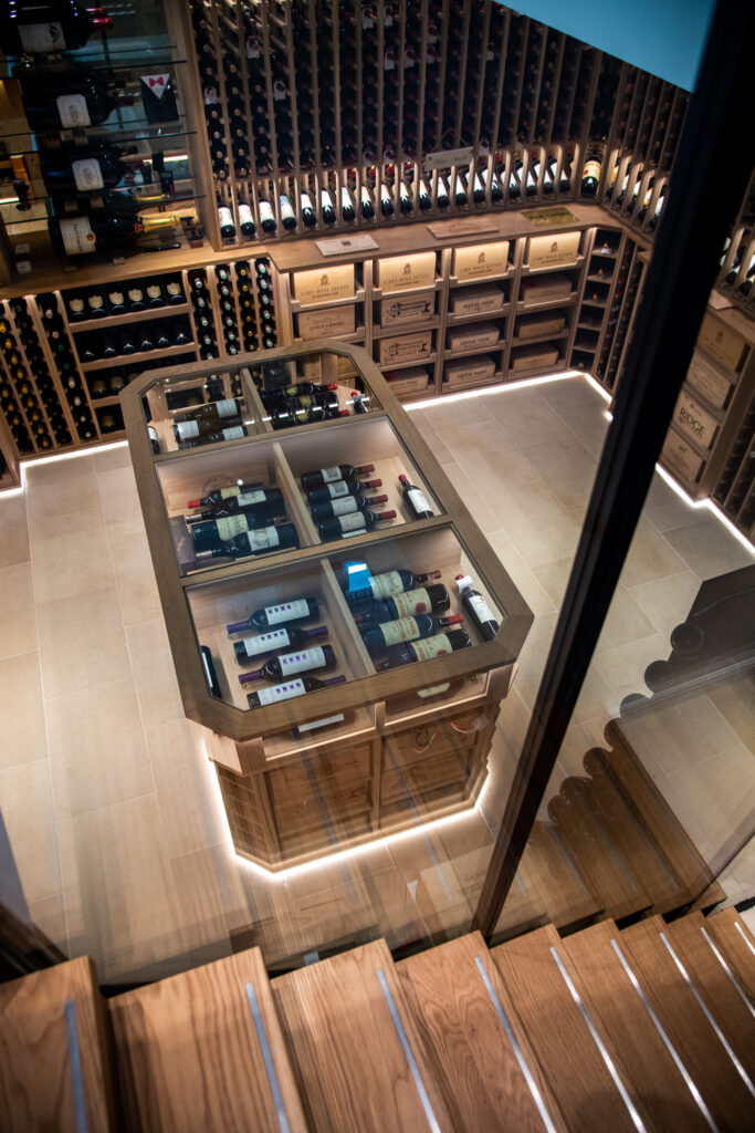 A ceiling-mounted temperature control system was discreetly integrated into the design, ensuring the cellar maintains optimal conditions for long-term wine storage. Fitted with an LED display for easy monitoring, the unit is subtle in appearance but plays a critical role in preserving the collection.