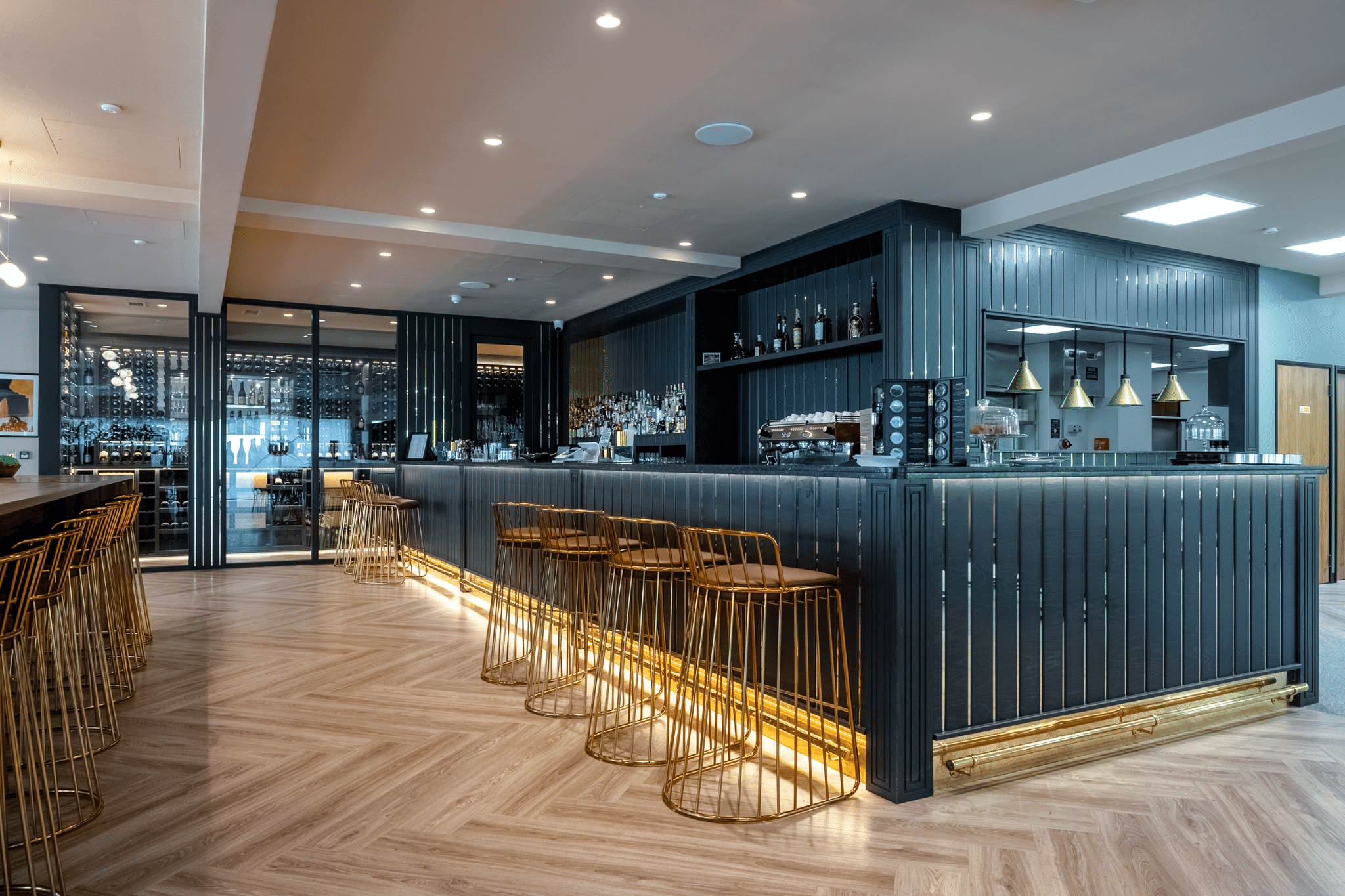 The bar, backbar, wine cellar and service hatch all feature gold inlay detailing, adding a refined contrast to the Havana black finish. This subtle touch elevates the visual language of the space, reinforcing the club’s premium aesthetic while maintaining consistency across all joinery elements.