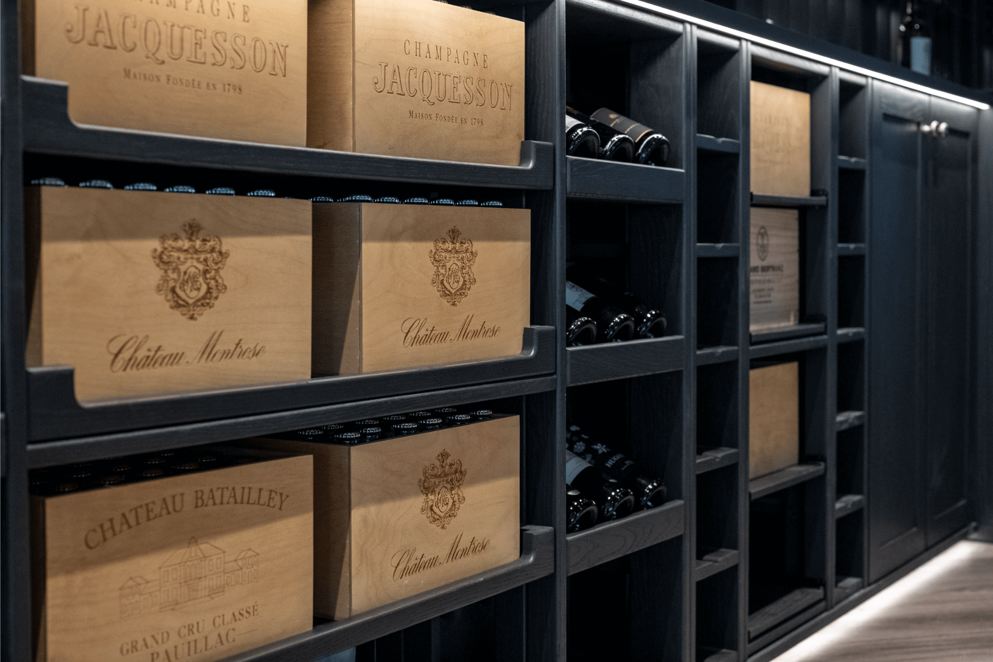 Inside the cellar, a continuation of the Havana black joinery provides full-height wine storage, configured to hold and present the venue’s extensive wine list. The materials and layout were selected to feel consistent with the rest of the bar area while offering purpose-built storage and clear visual organisation.