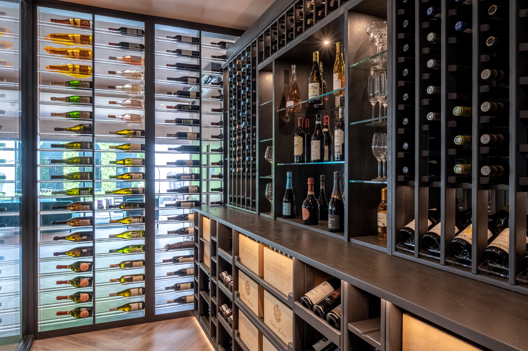 Within the glazed wine cellar, a slim wall features floor-to-ceiling acrylic racking, offering label-forward bottle storage without visually interrupting the open feel of the space. The clear material ensures the wines are on show, while maintaining the minimalist, architectural aesthetic of the cellar’s glass enclosure.