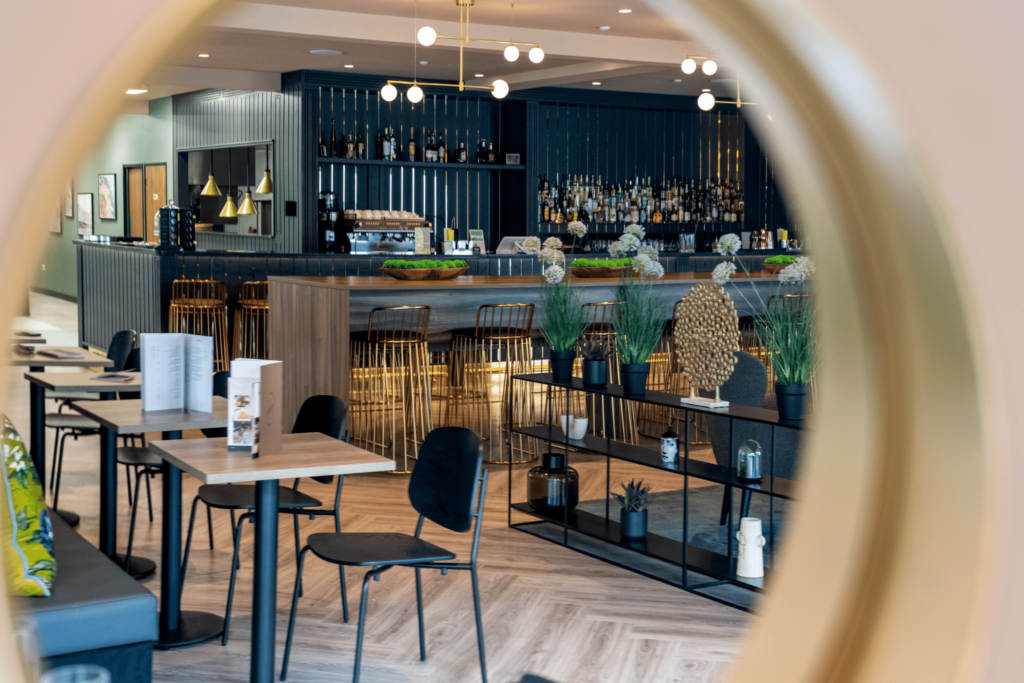 The kitchen service hatch was designed and manufactured to mirror the bar and wine cellar detailing, complete with Havana black joinery and gold inlays. This consistency ensures the design flows seamlessly between guest-facing areas and back-of-house, unifying the space through material and proportion.